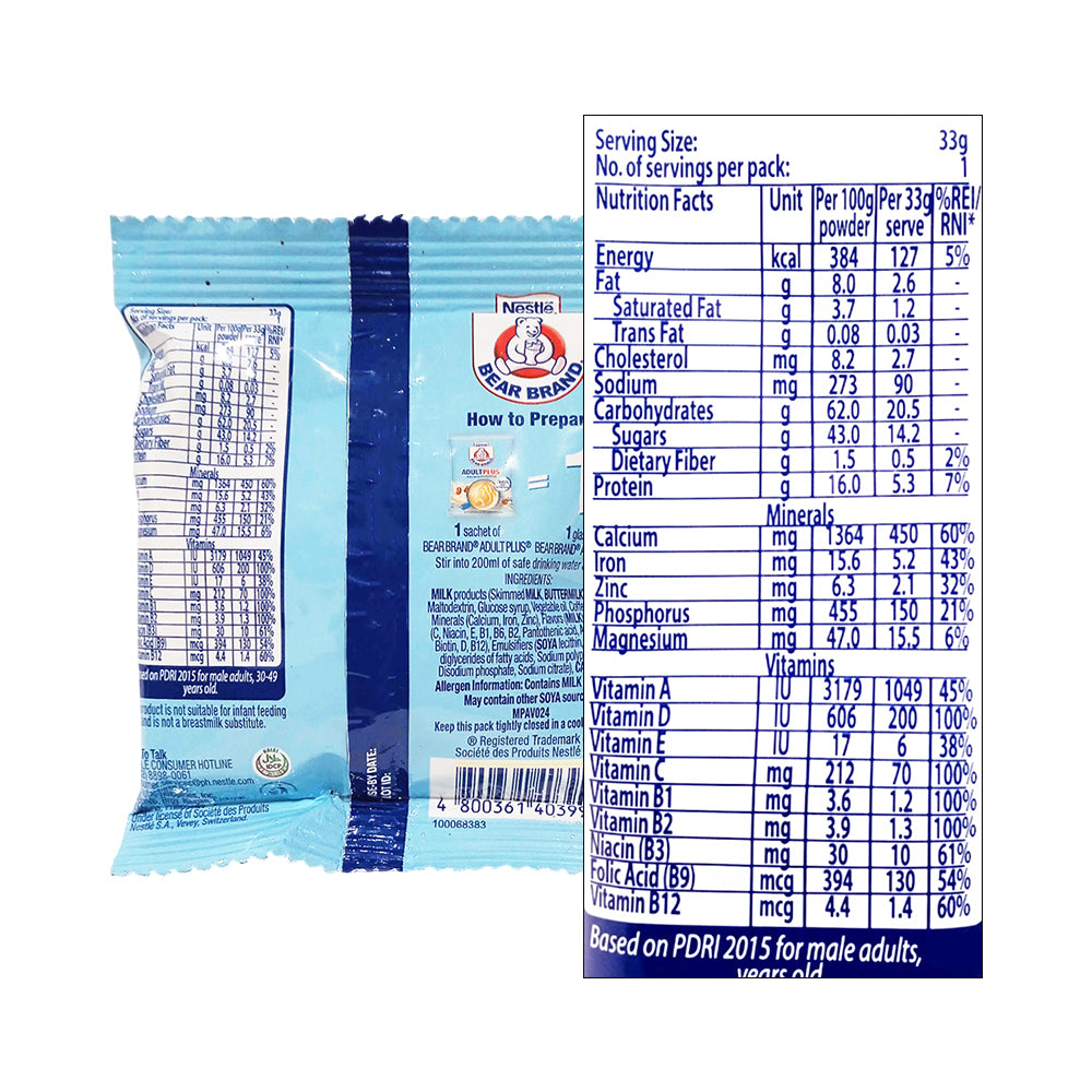 - Sold per 1 sachet contains 33 grams of Bear Brand Adult Plus Milk With Coffee.