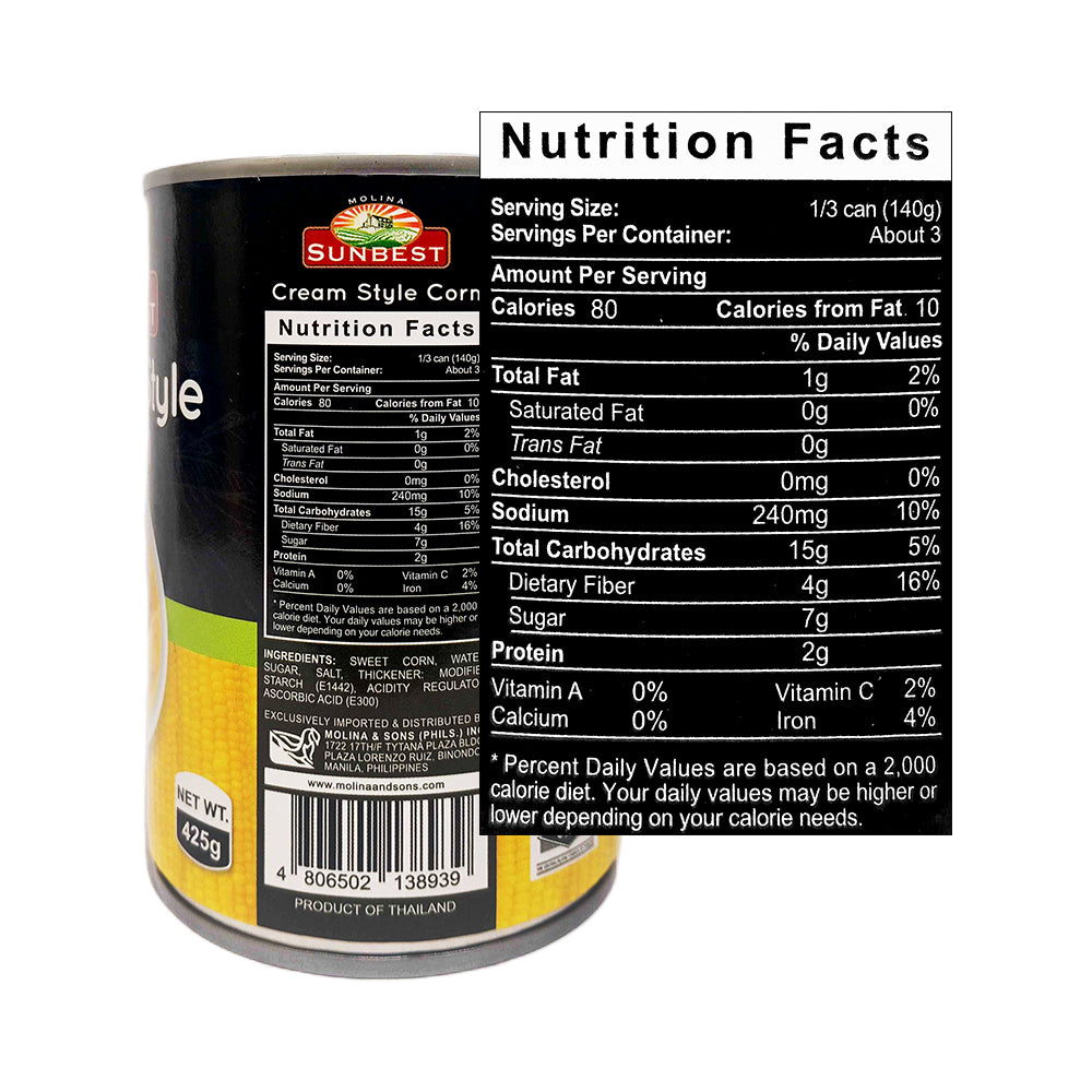 - Sold per 1 can contain 425 grams of Sunbest Cream Style Sweet Corn.