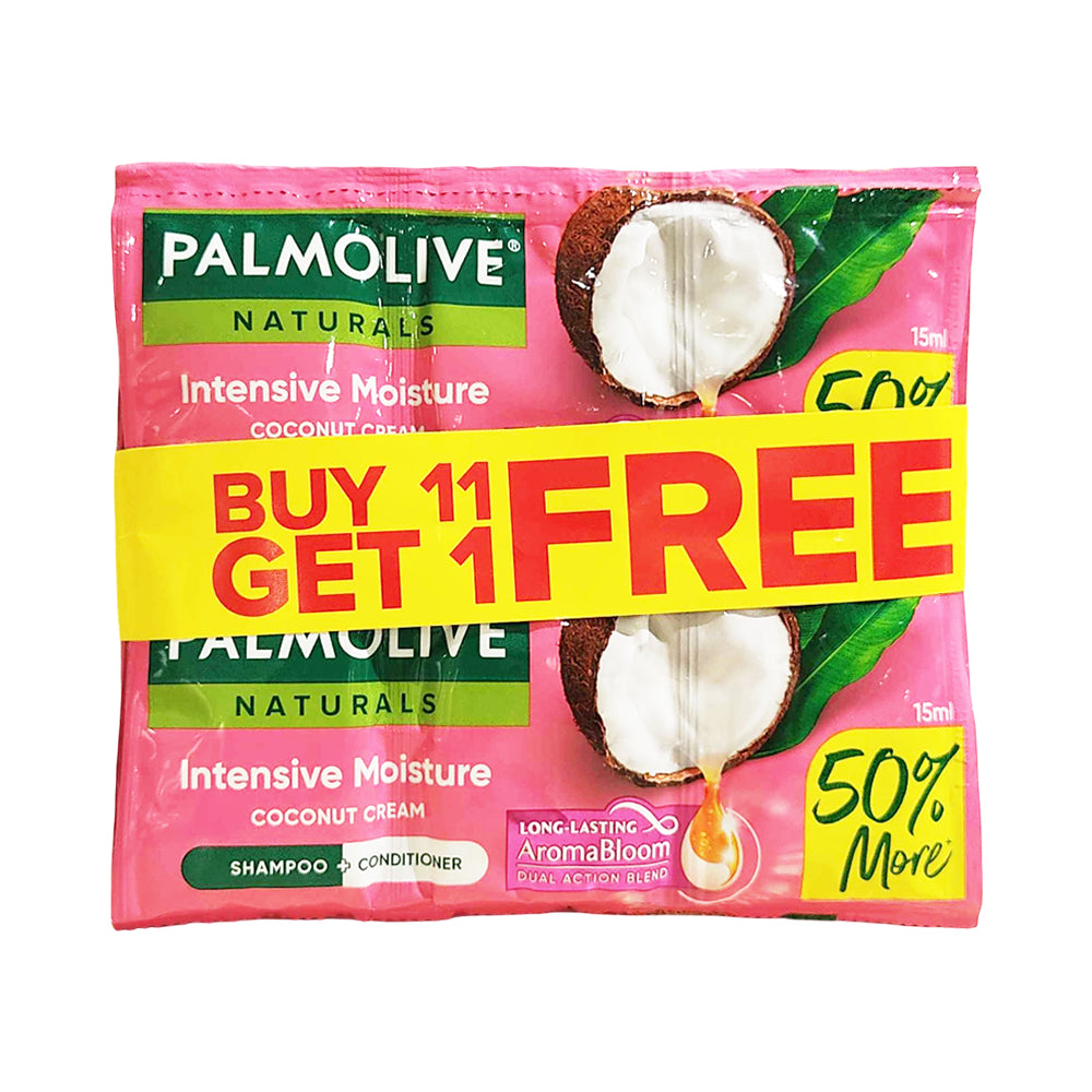 - Sold per tie in 11 pieces (15ml each) of Palmolive Shampoo And Conditioner 50% More Intensive Moisture with 1 piece free.
