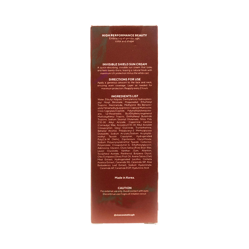 - Shield your skin from the sun’s harshest rays with Vice Cosmetics Sunwear Invisible Shield Sun Cream.