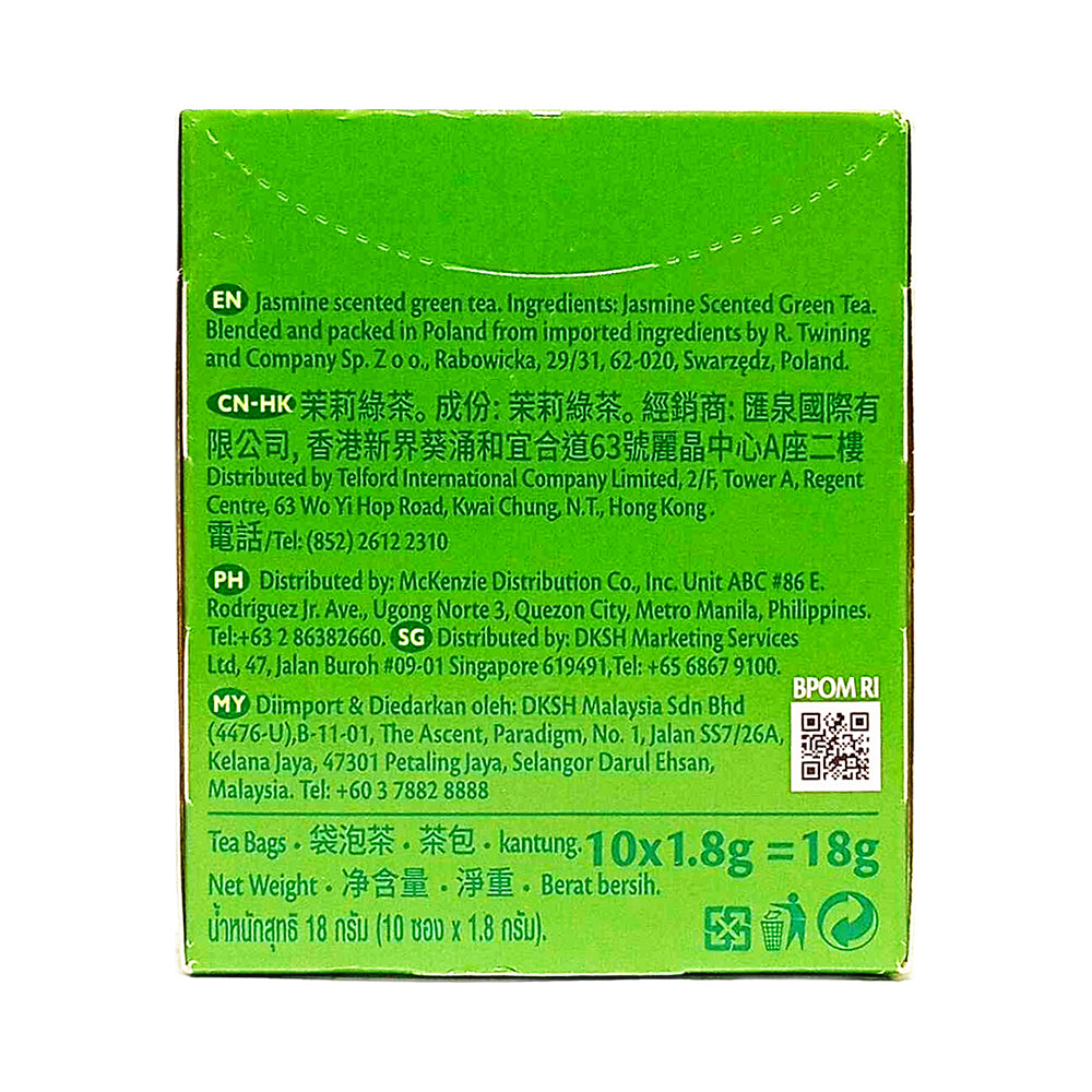 - Each box contains 10 individually wrapped tea bags (1.8 grams each) of Twinings Green Tea Jasmine.